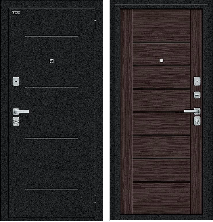 Надежная входная Дверь Браво Техно/BChrome Букле черное/Wenge Melinga премиум класса по цене 30 500 руб. Большая толщина стали защитит от проникновения в ваш дом, квартиру или коттедж. Используется очень качественная фурнитура: замки, цилиндры, ручки, защелки. Покрытие и отделка двери изготовлено под внимательным контролем производителя. Дверь имеет долгий срок службы и гарантию.